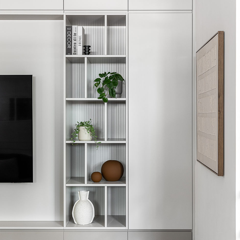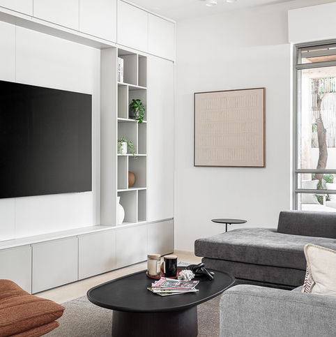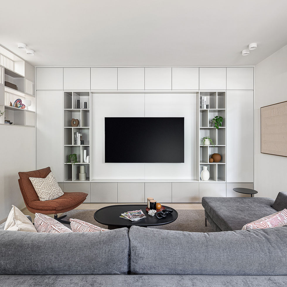 בקיר המרכזי בסלון תוכננה נגרות מותאמת, המשלבת טלוויזיה, אחסון פונקציונלי ואלמנט דקורטיבי.