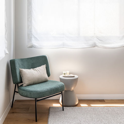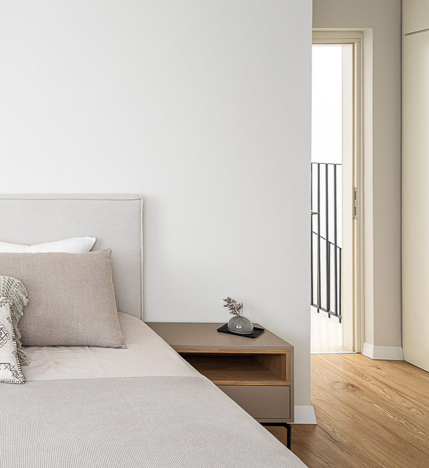 בקומת החדרים בוצע ליטוש וחידוש לפרקט הקיים. חדר השינה של ההורים הולבש בגוונים רכים ונעימים. המיטה הונחה על שטיח גדול שמגדיר את האזור, ולצידה כורסא בגוון ירוק עמוק שמזמינה לעצור לרגע של שקט.
