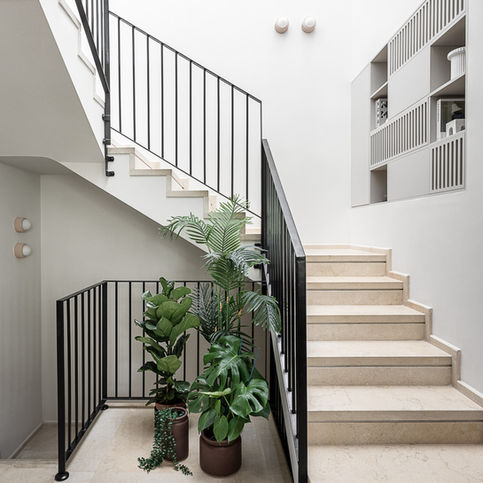 גרם המדרגות חודש עם מעקה מודרני בקווים נקיים, ולצידו תוכננה נגרות דו-צדדית שמציעה גם חציצה וגם הצצה – פתרון שהוא גם פרקטי וגם אסתטי.